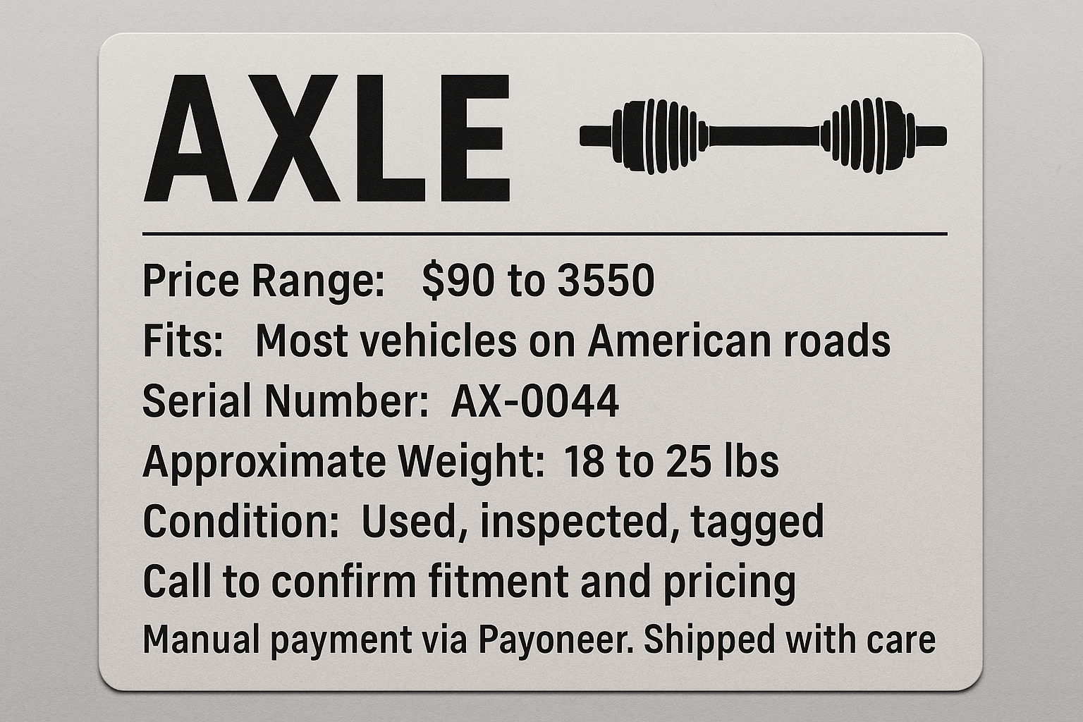 Manual payment via Payoneer. Shipped with care